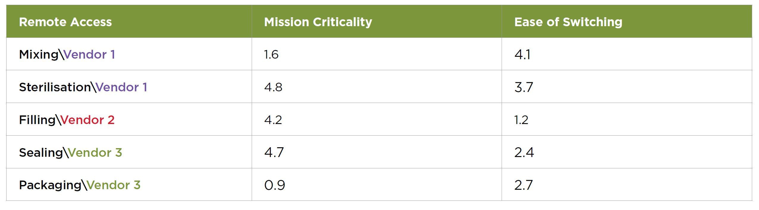 Once all vendors and assets requiring access are prioritised, use metrics to evenly compare all vendors (see Table 1). Then plot these scores based on mission criticality versus ease of switching to plan your strategy and next steps (Figure 1).