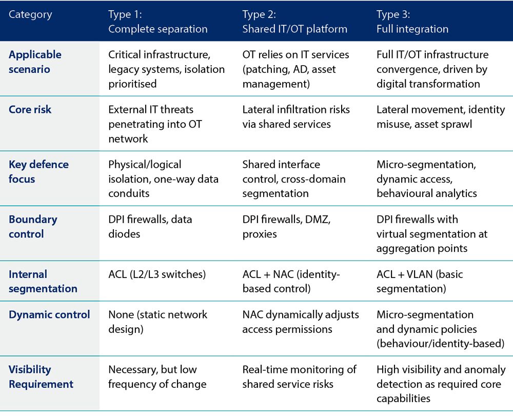 As the digital transformation trend accelerates, full integration (Type 3) architectures have become prevalent, driven by the need for unified infrastructure and resource optimisation. This shift requires replacing physical boundaries with logical segmentation, dynamic access control and continuous monitoring to manage the expanded attack surface.